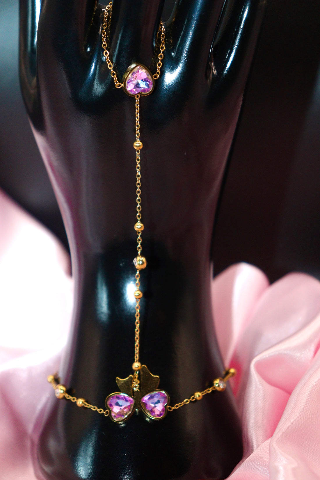 A playful stainless steel gold hand chain, featuring a delicate purple bow pendant. Feminine flair...
