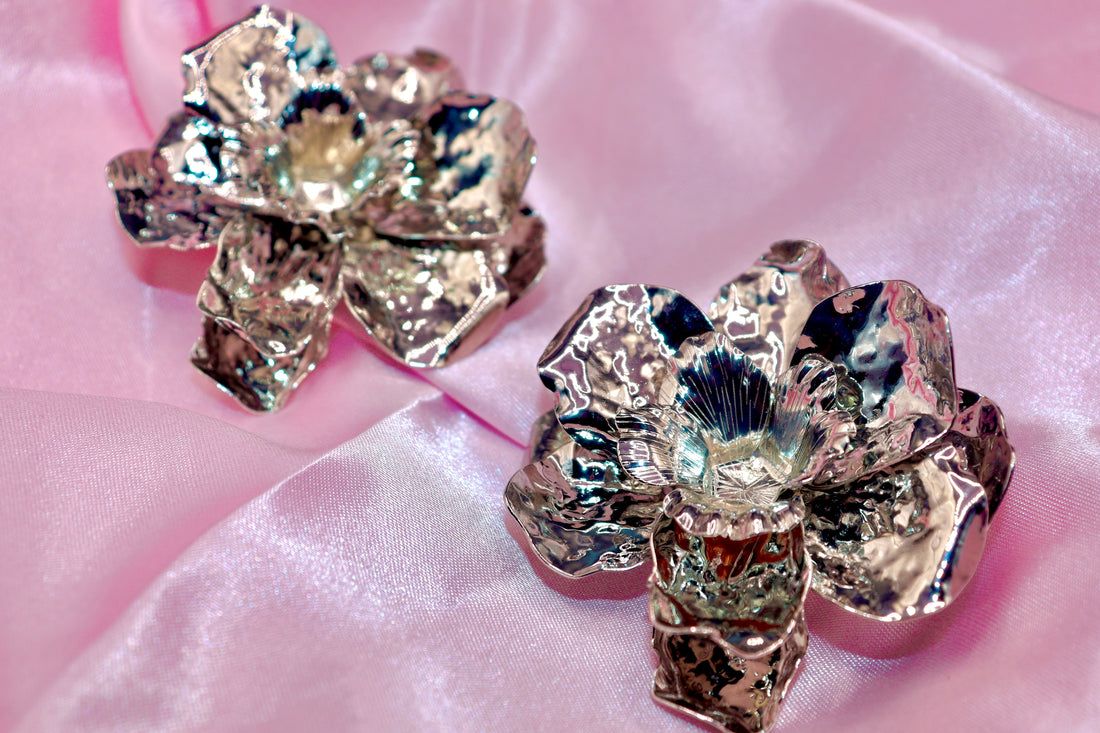 Textured metal earrings with a dual-tone floral motif, available in gold or silver. A statement...
