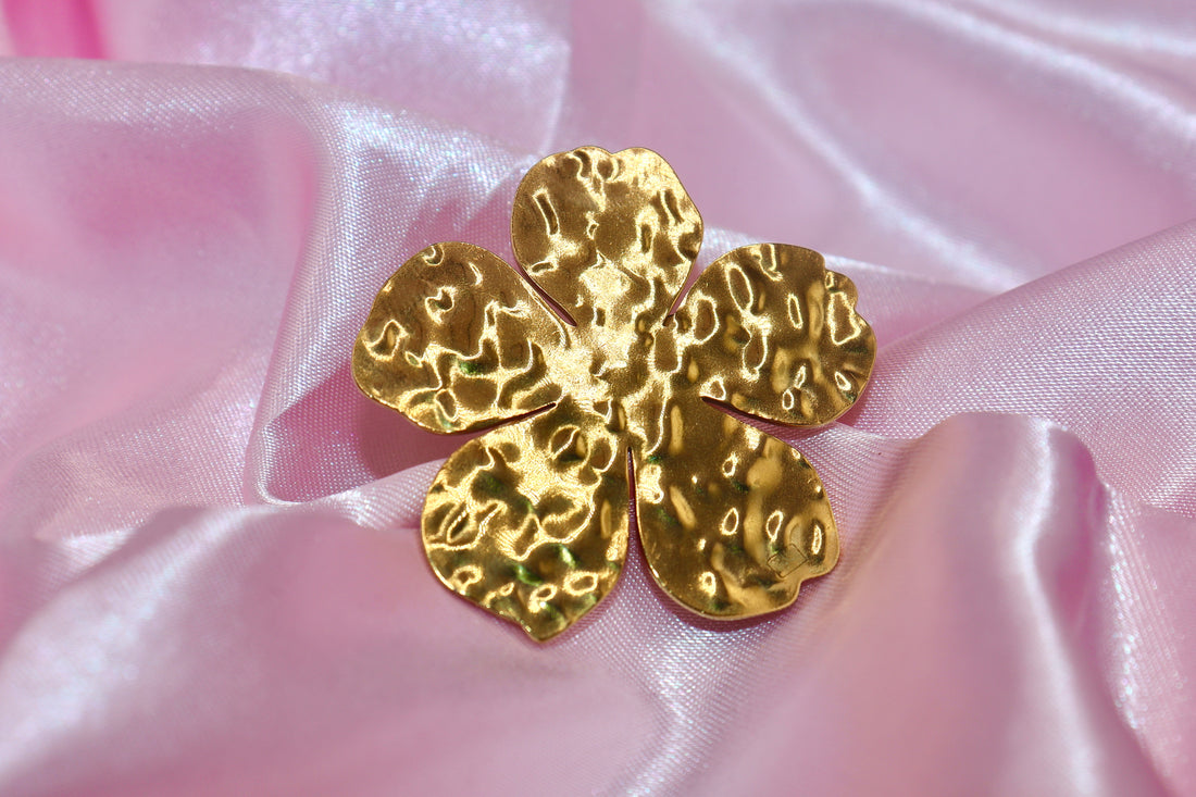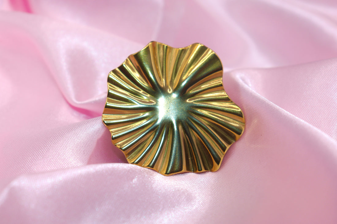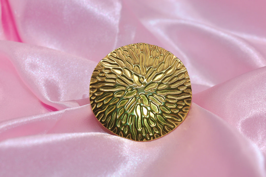 A textured flower ring in golden stainless steel. Whimsical and feminine, made to endure with...