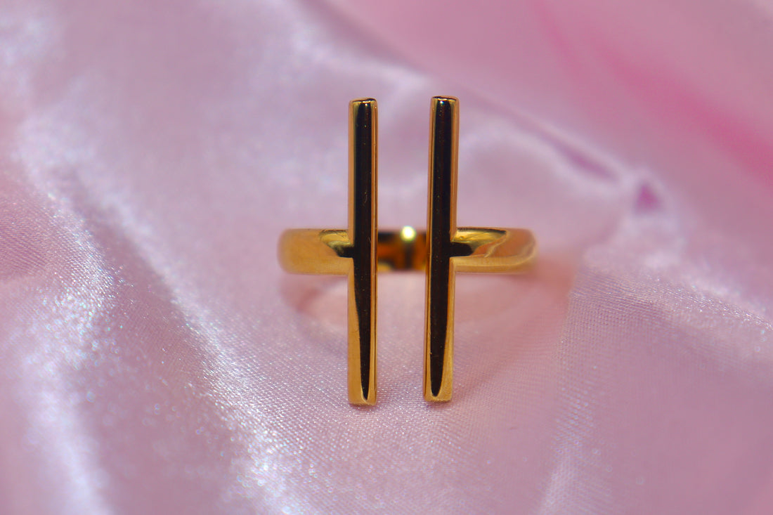 A modern golden ring featuring a clean "H" silhouette. Made from stainless steel and supported...