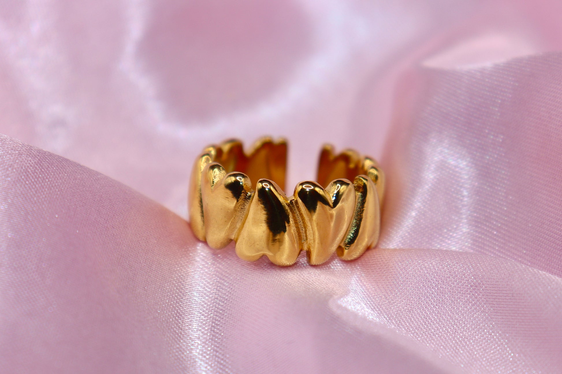 A lovely golden ring adorned with multiple heart details. Delicate, sweet, and made of stainless steel with a 3-year guarantee.