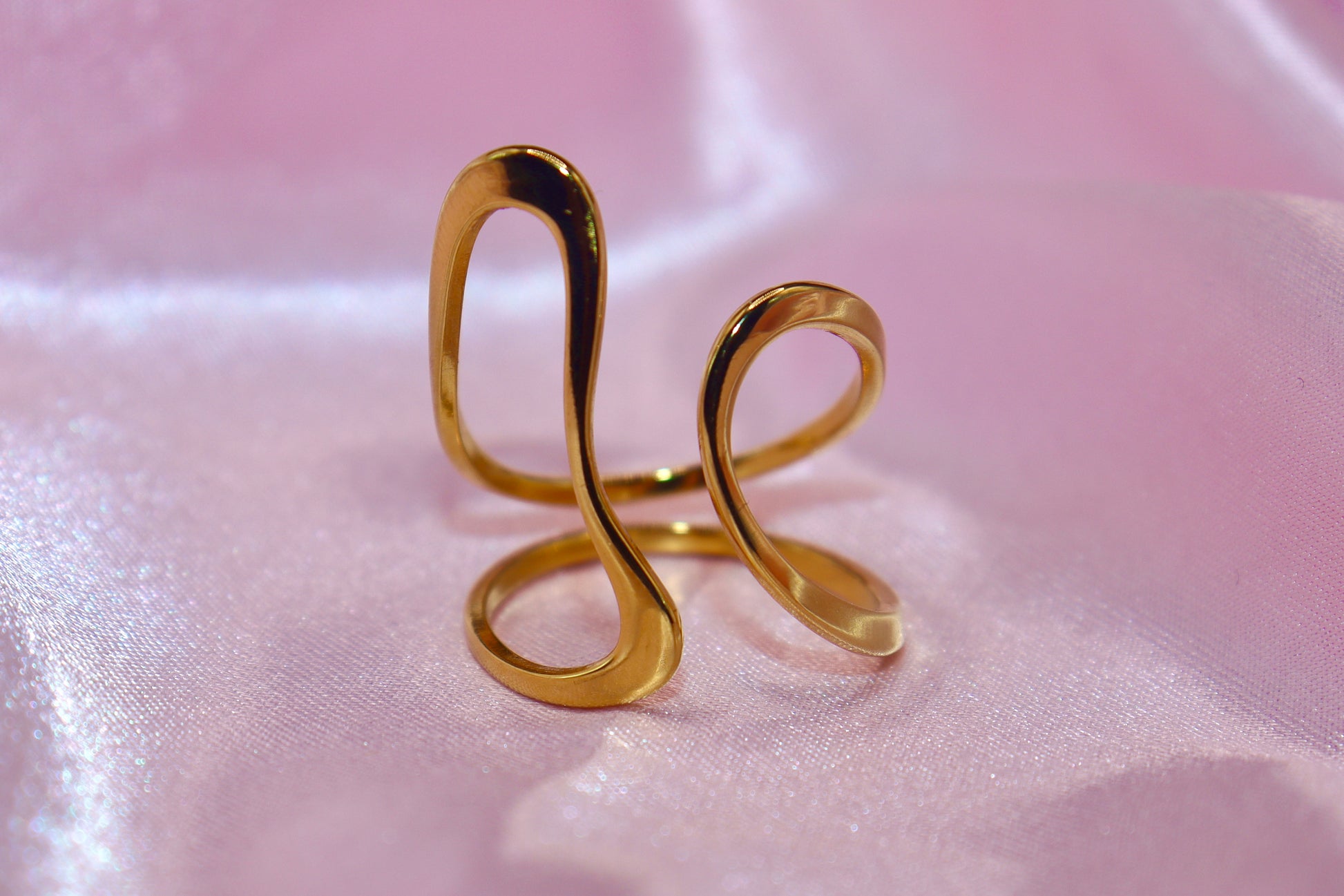 Another abstract golden ring with gentle curves and an elegant silhouette. Crafted in stainless steel and backed by a 3-year guarantee.