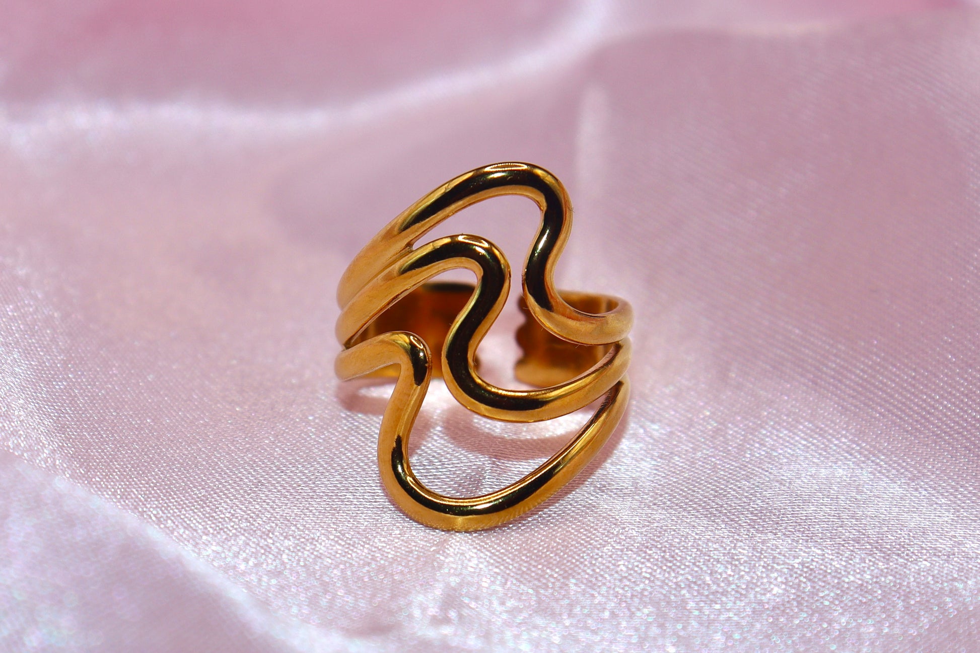 This abstract golden ring features a sculptural, artistic design. Bold and expressive, made from stainless steel with a 3-year guarantee.