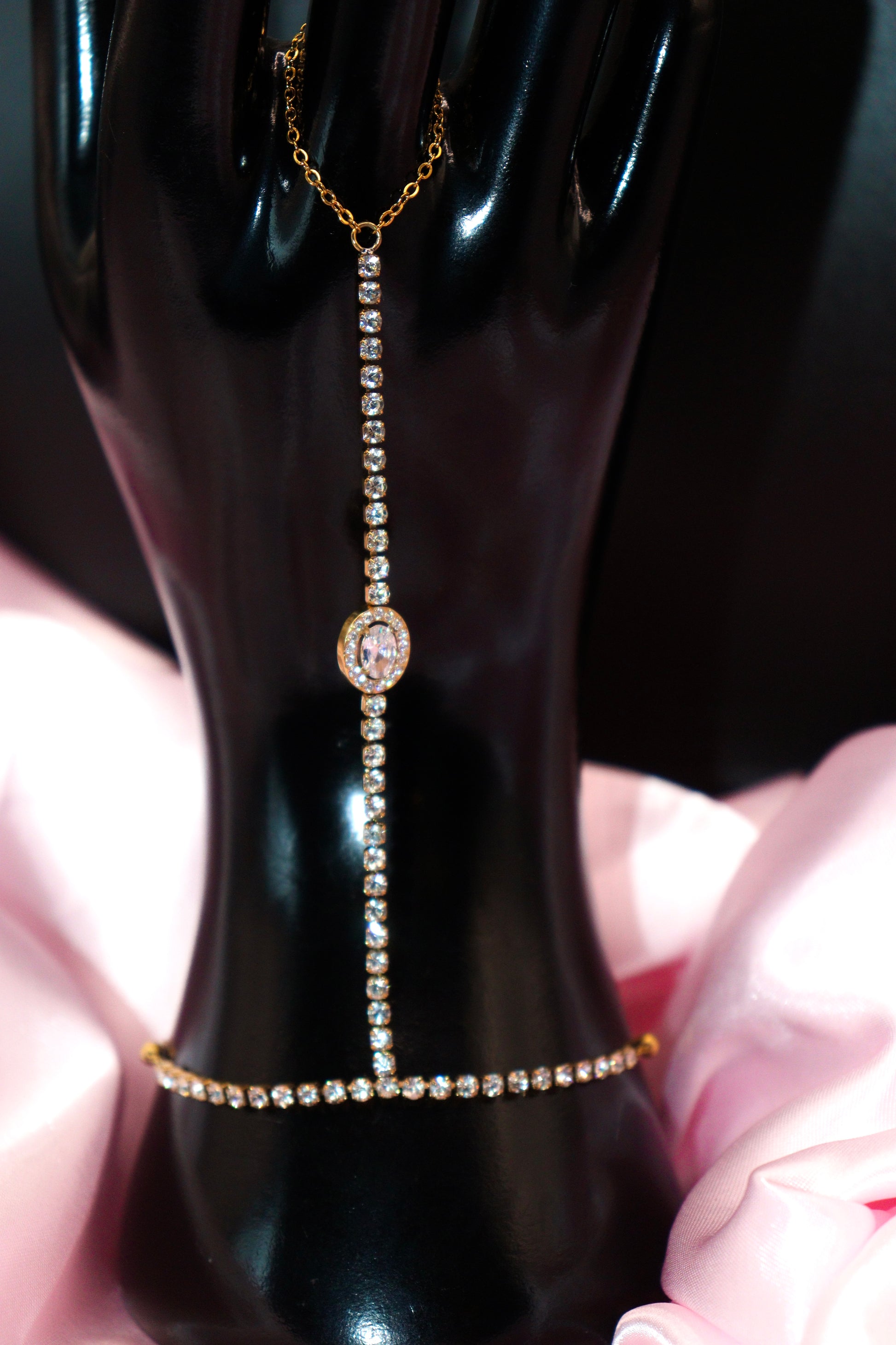 A luxurious hand chain in stainless steel gold, featuring diamond embellishments and a stunning oval centerpiece. Elegant and distinctive, with a 3-year quality guarantee.
