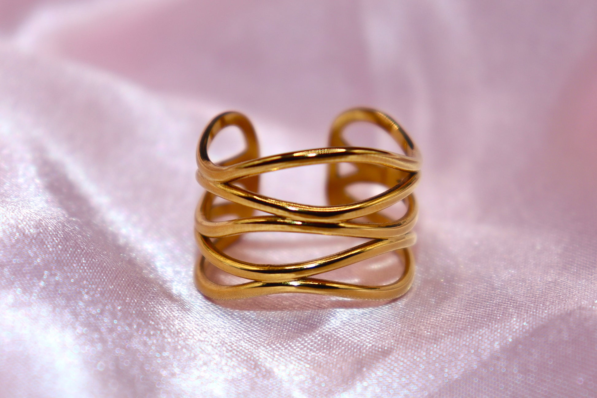 A golden abstract ring with cosmic curves and artistic flair. Durable stainless steel makes it wearable every day, with a 3-year guarantee.