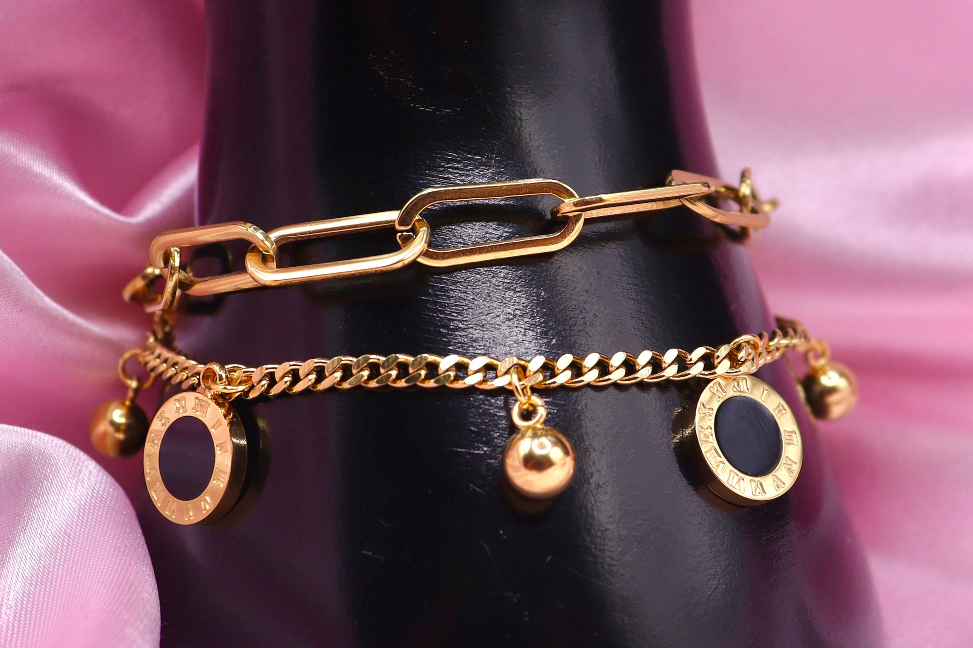 With a rich black diamond Roman-style charm, this stainless steel gold two-layer bracelet brings classic luxury with a modern twist. Designed to stand out and last, with a 3-year guarantee.