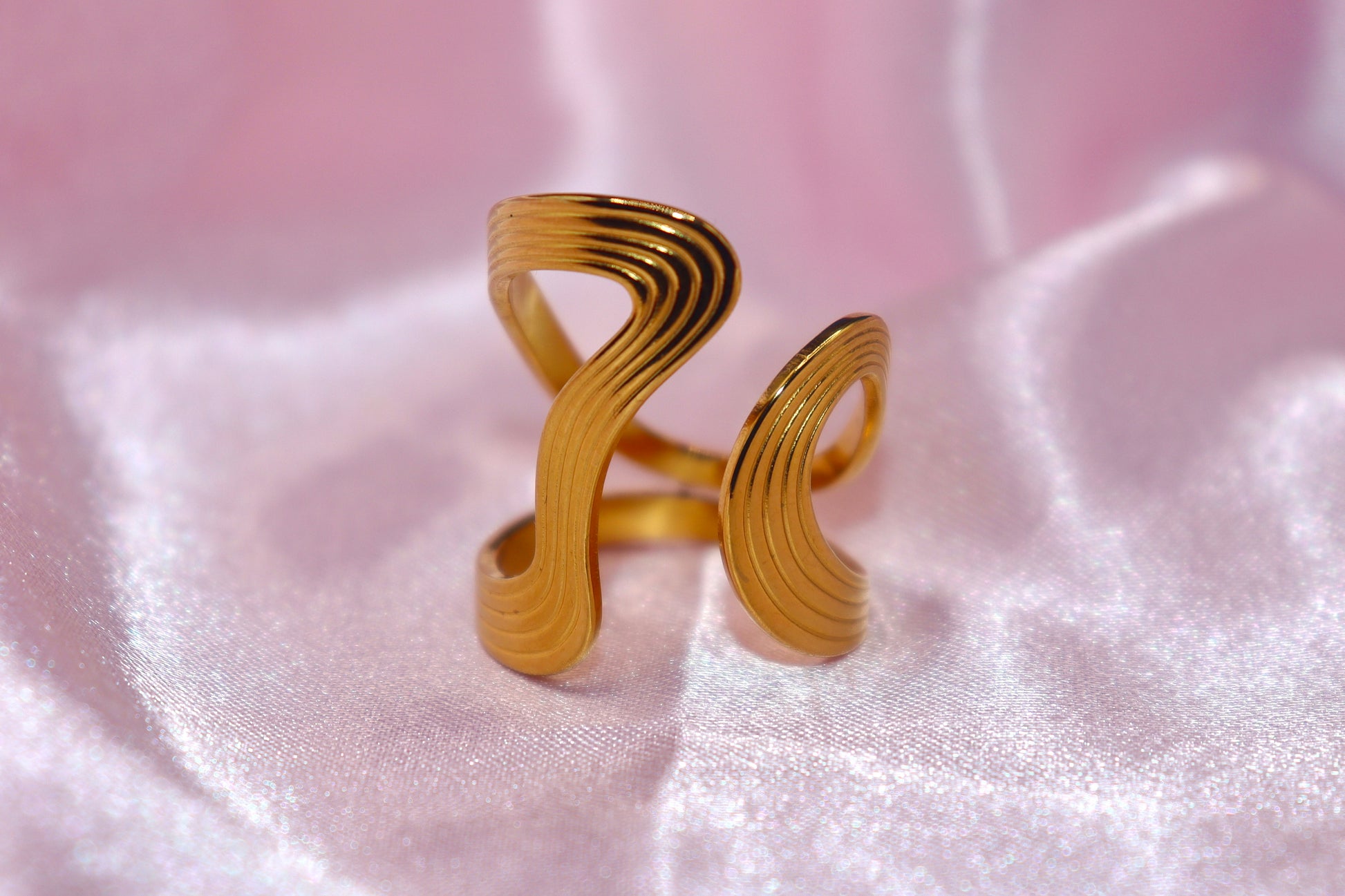 This abstract golden ring offers modern minimalism in an open design. Built from stainless steel and protected by a 3-year guarantee.