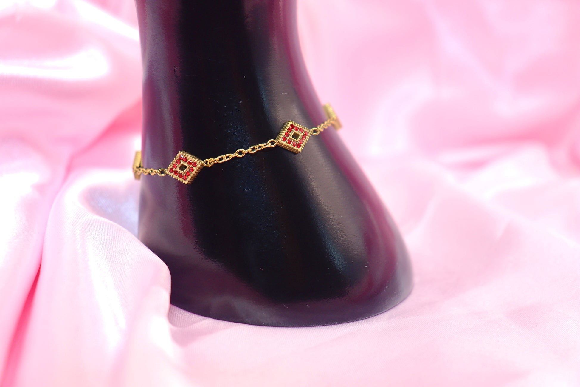 Vivid and eye-catching, this stainless steel gold bracelet is adorned with red rhinestones. A bold statement piece with lasting quality and a 3-year guarantee.