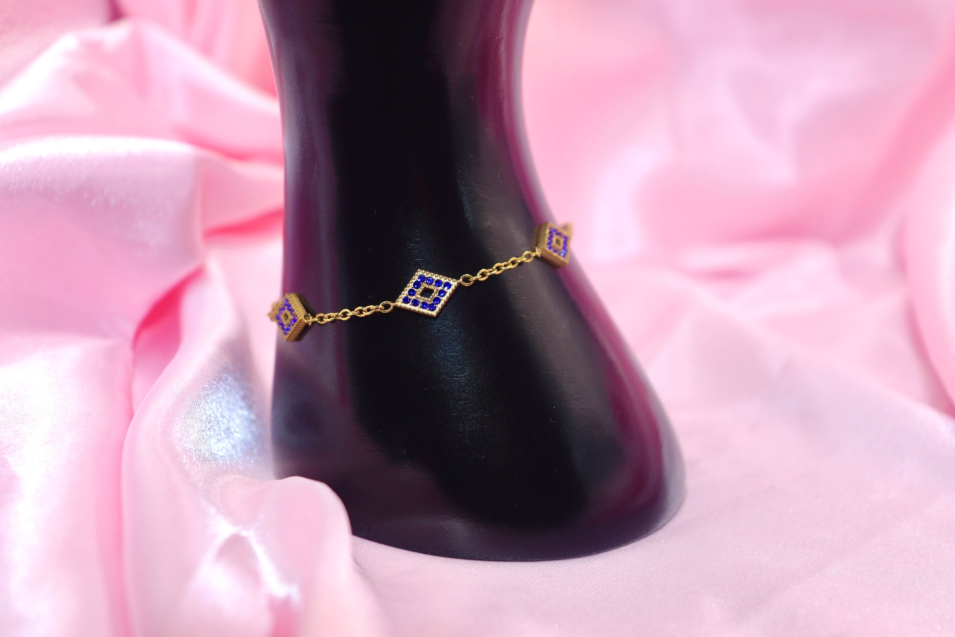 Vivid and eye-catching, this stainless steel gold bracelet is adorned with blue rhinestones. A bold statement piece with lasting quality and a 3-year guarantee.