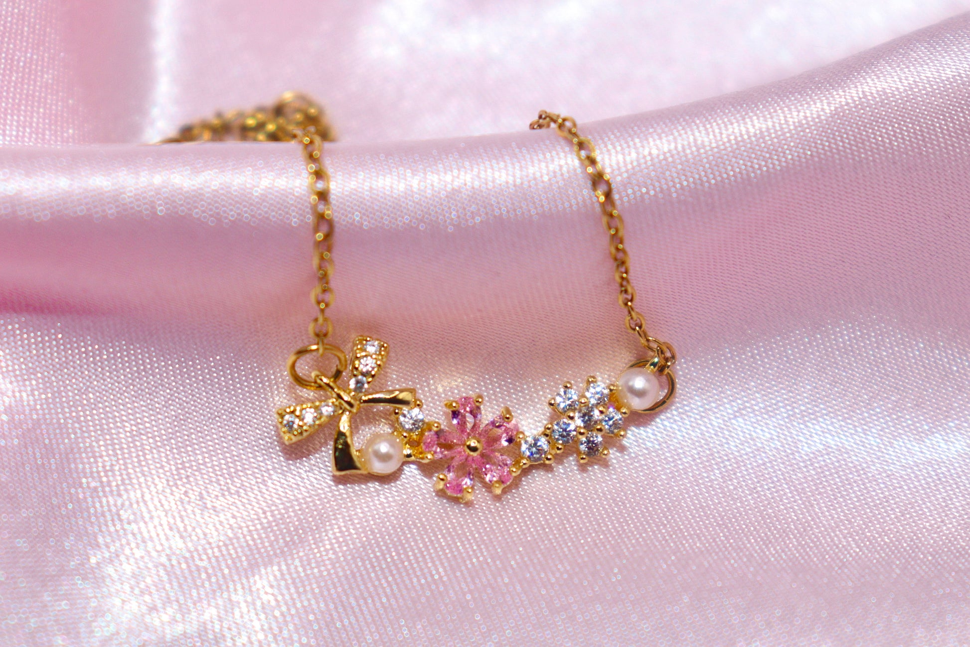 A sweet and feminine piece featuring bows, flowers, and pearls in a charming pink tone. Crafted from stainless steel and built to last with a 3-year guarantee.